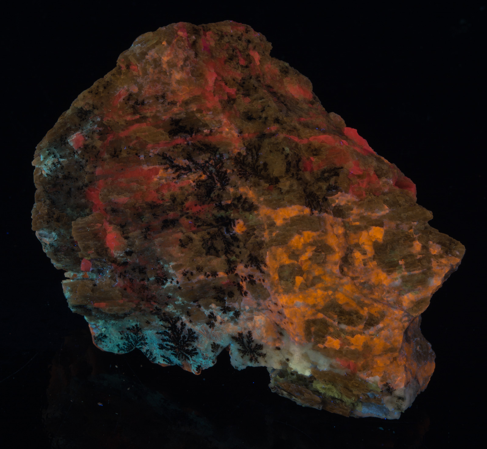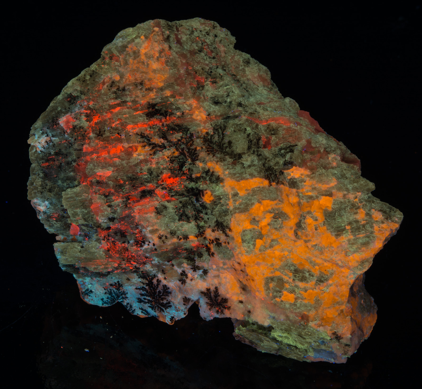 This piece was identified as green sodalite. I have my misgivings on that ID - I think it is hauyne and gonnardite. A fresh face reveals massive phlogopite (I think) along with brightly yellow fluorescing hauyne (or sodalite?). The really strange mineral to me is the bright orange. It does not have calcite cleavage, is really not very fluorescent under midwave, and has a very distinct color.