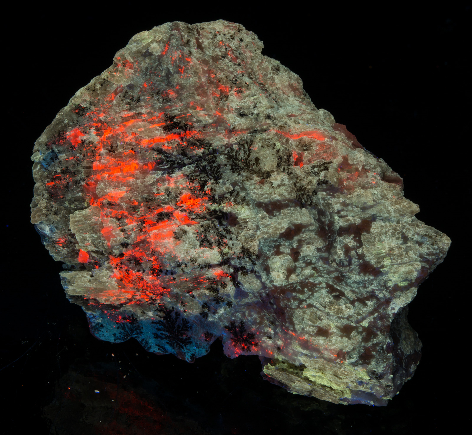 - Fluorescence under Midwave (305nm Lamp/Mercury) UV light: Red