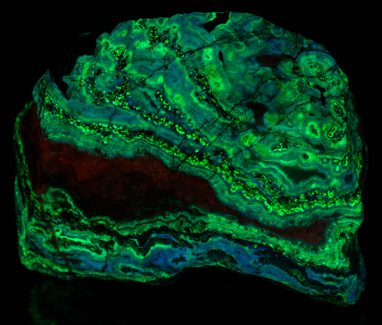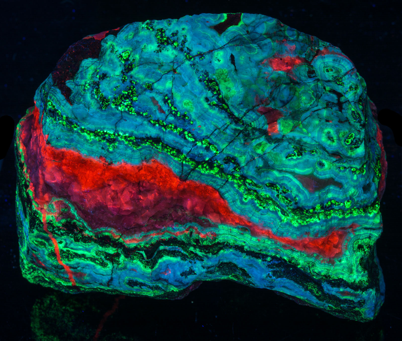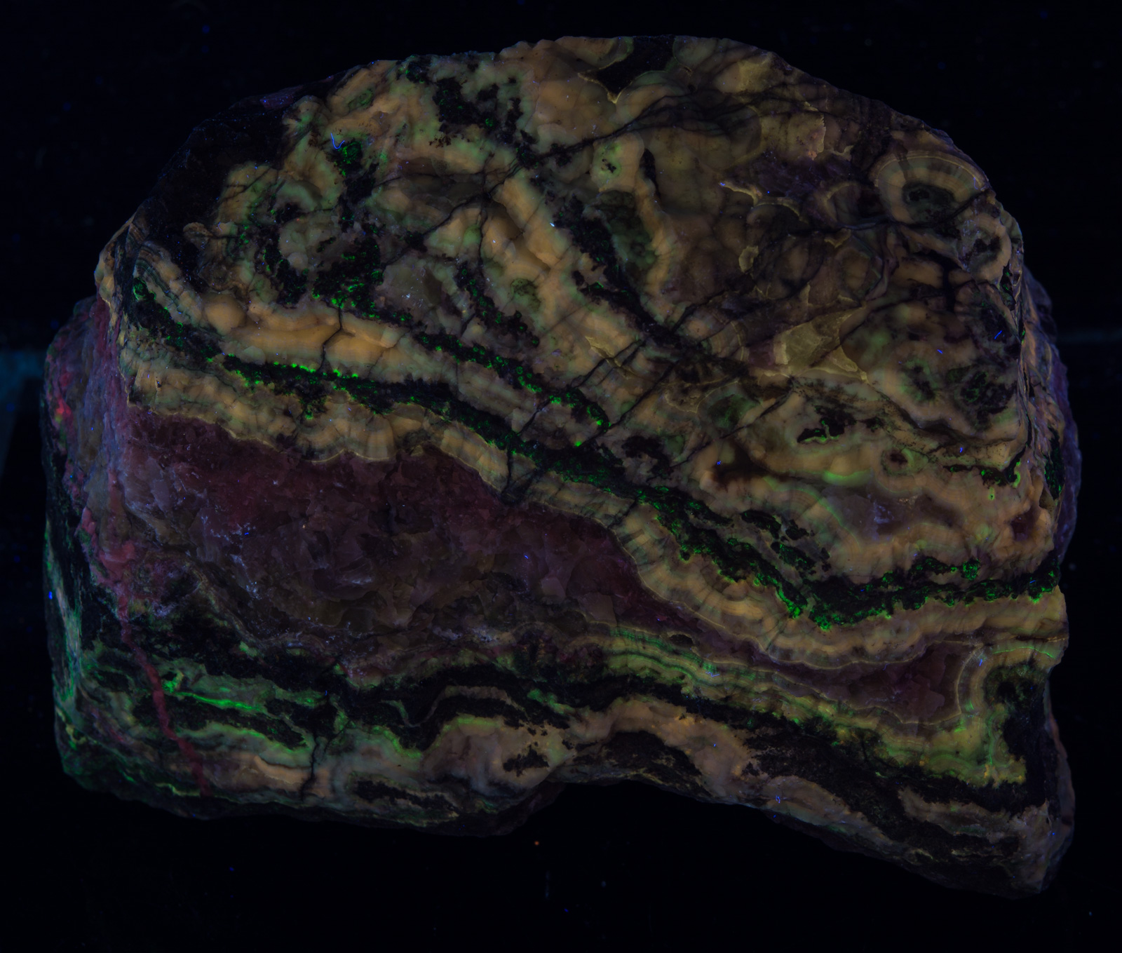 This is an exquisite specimen from the Third Plain Zinc Mine in Australia. Very bright under shortwave (actually brighter than most of its brethren from the Puttapa mine) it also offers up a dramatic phosphorescence, and a yellow fluorescence under MW to boot. Both the green and bluish fluorescence appear to be willemite, while the orange/red is calcite. There may be other unknowns in this piece. Do not miss the phosphorescent picture - quite amazing.