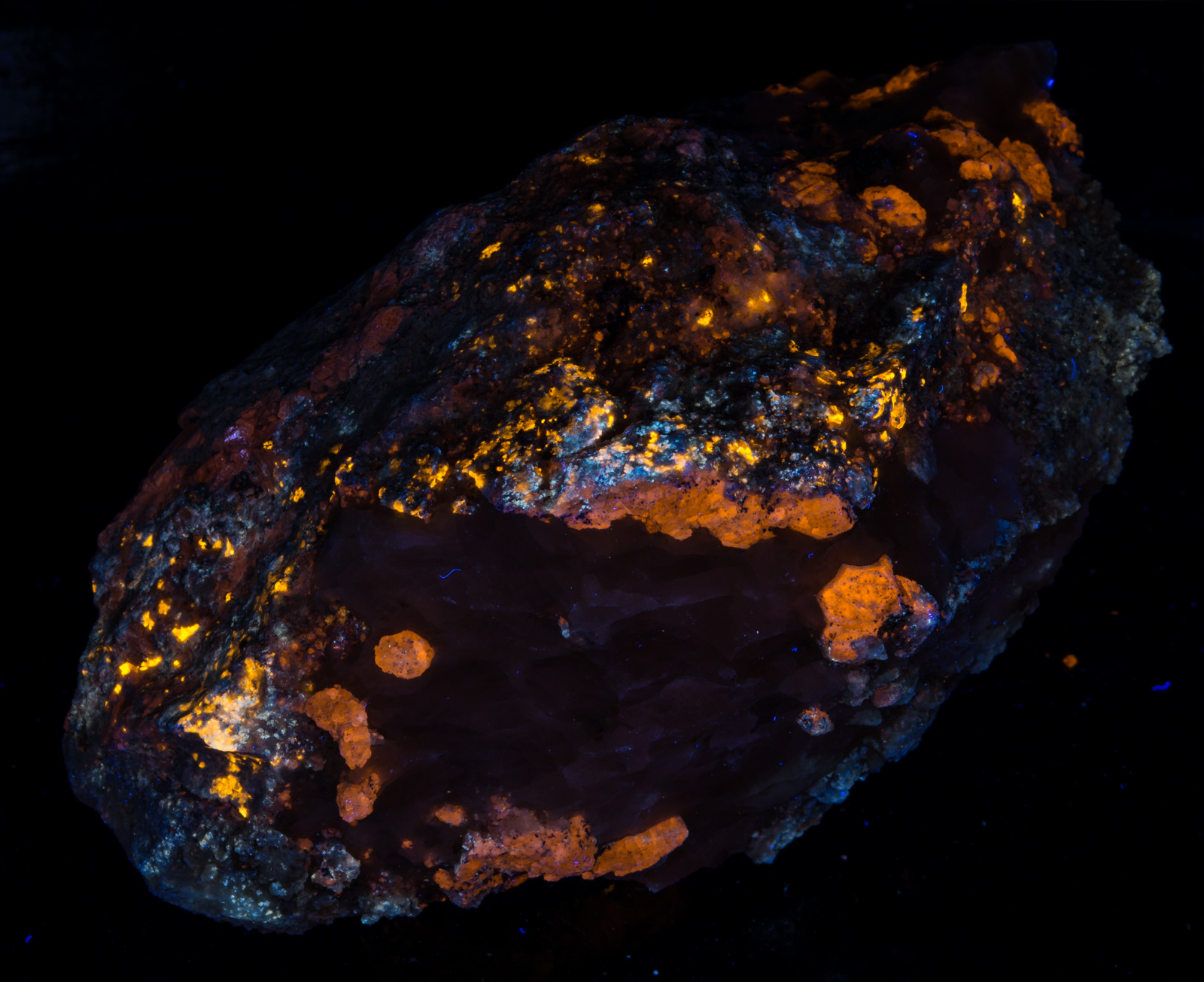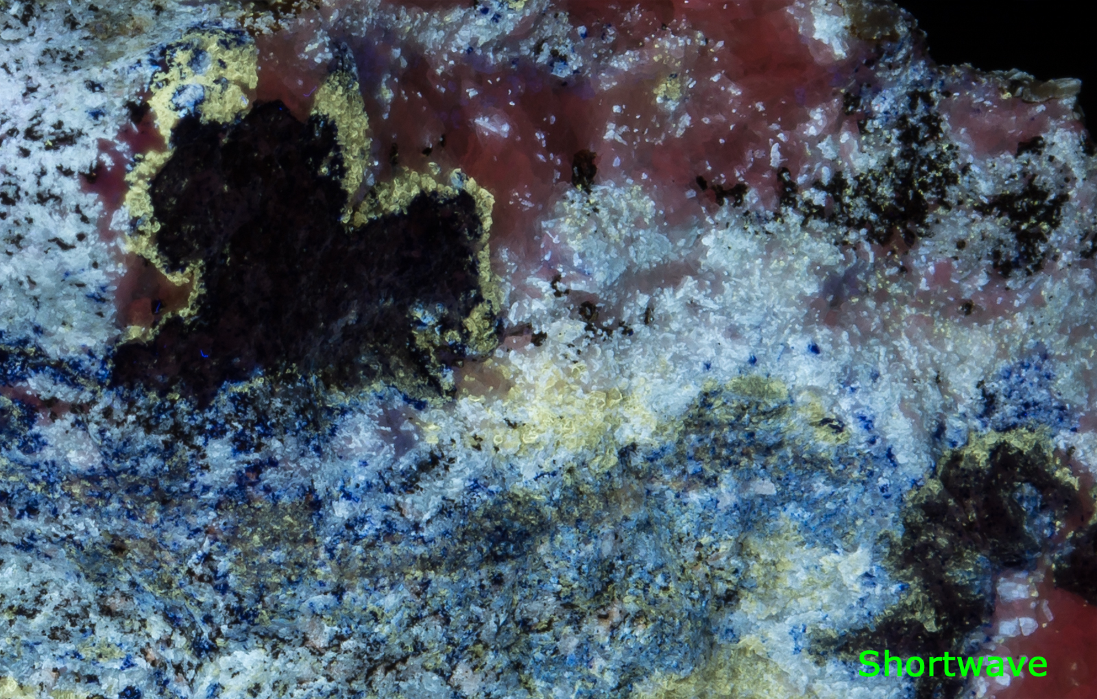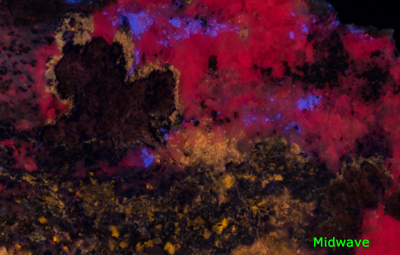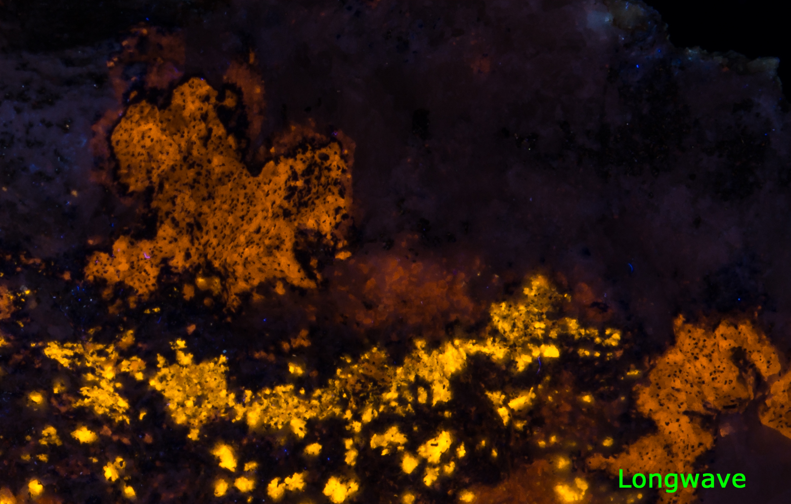 Midwave causes the calcite to pop very nicely. Longwave brings out the orange color of the afghanite crystals. MW and LW bring out the bright yellow of the marialite very nicely. If I were to display it under only one light, I would probably pick SW, preferably with a LW "kicker".