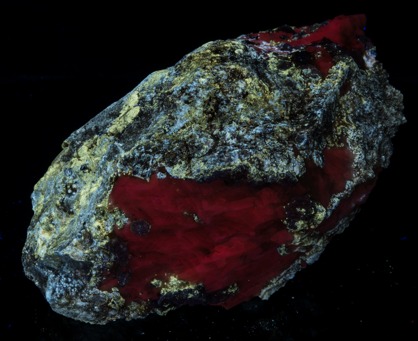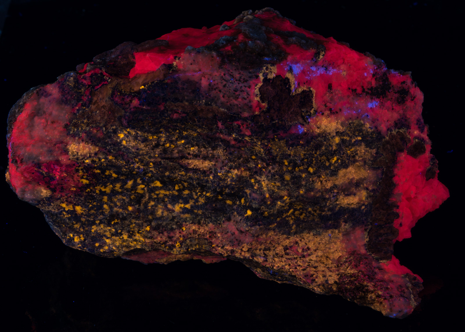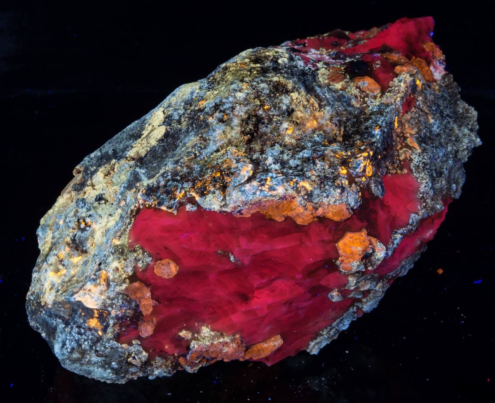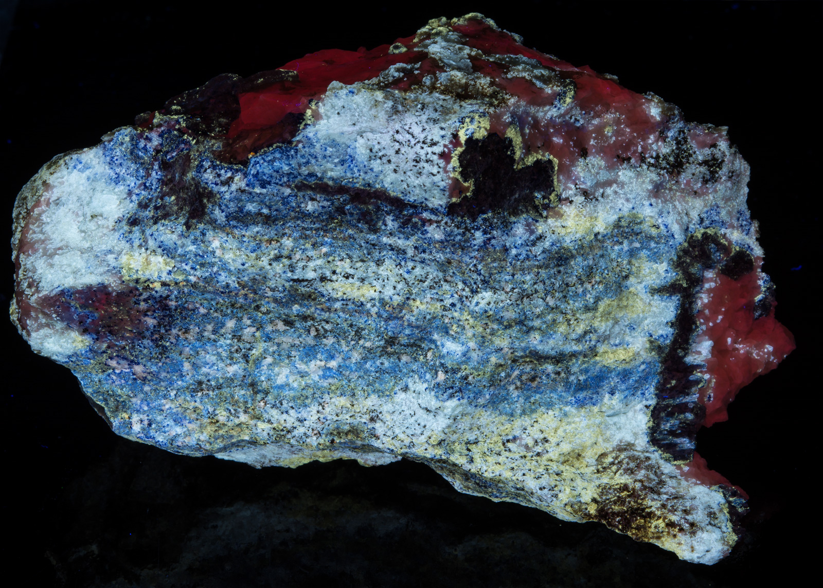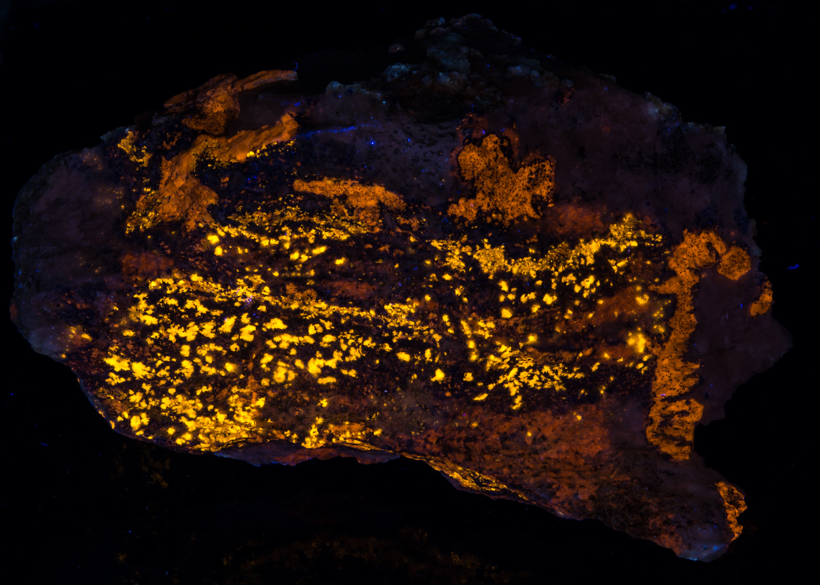 Midwave causes the calcite to pop very nicely. Longwave brings out the orange color of the afghanite crystals. MW and LW bring out the bright yellow of the marialite very nicely. If I were to display it under only one light, I would probably pick SW, preferably with a LW "kicker".