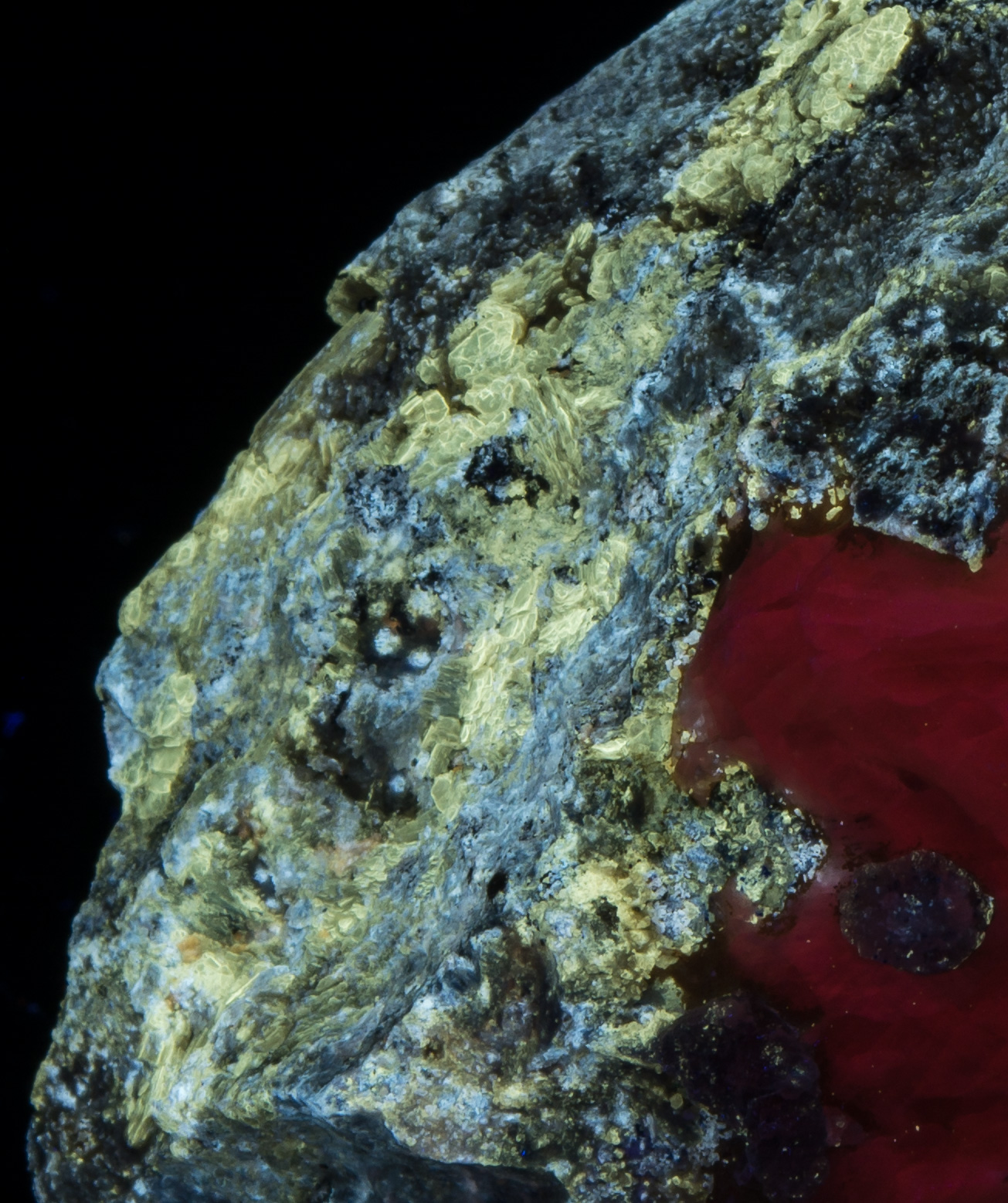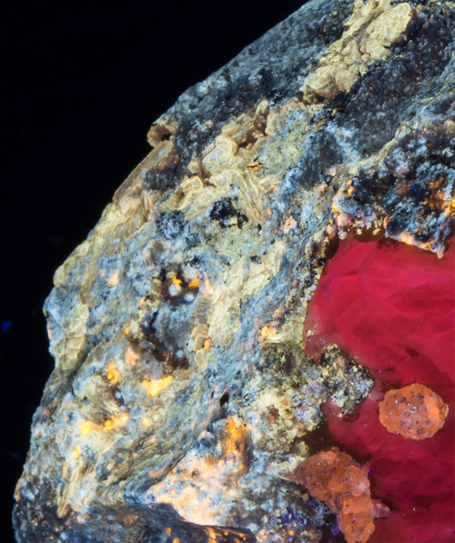 The closeups below show various interesting areas. Note that the phlogopite on this piece is fluorescent, a bright yellow SW and a butterscotch under MW. Click any thumbnail for larger pictures.