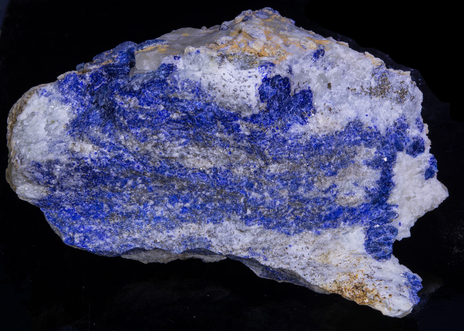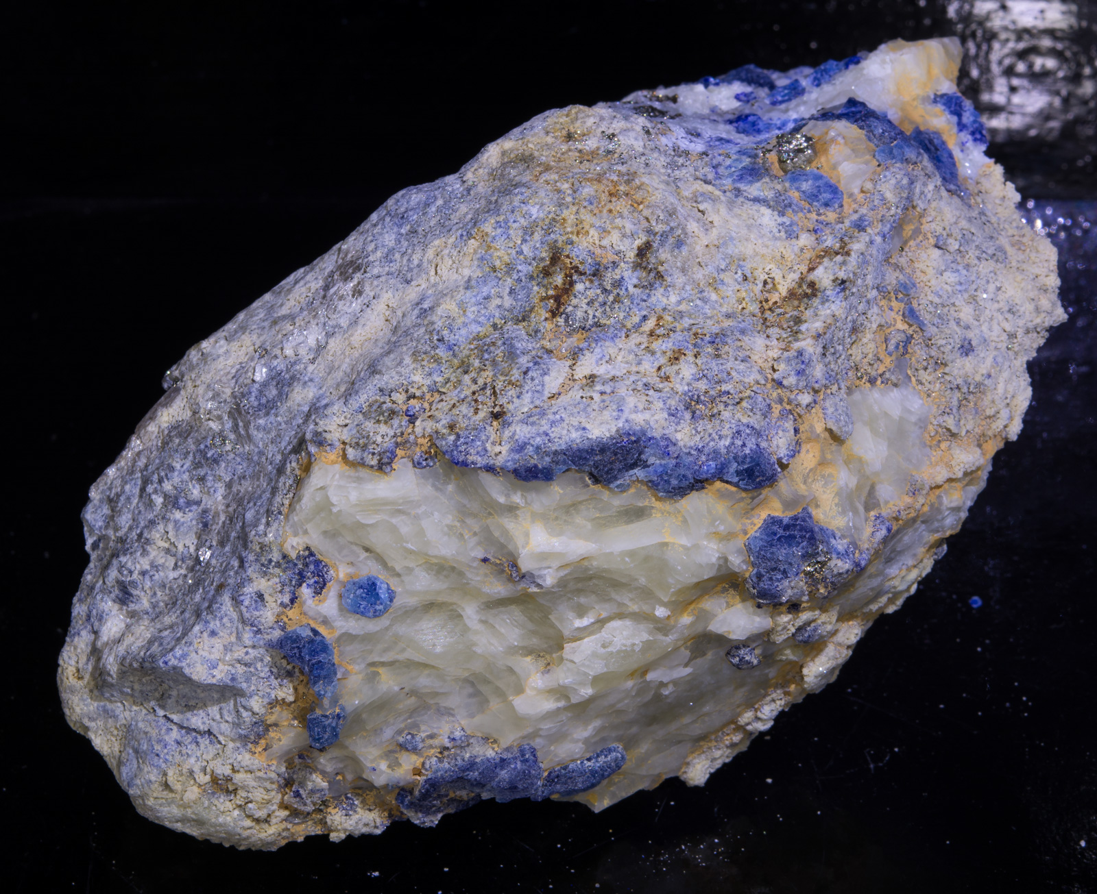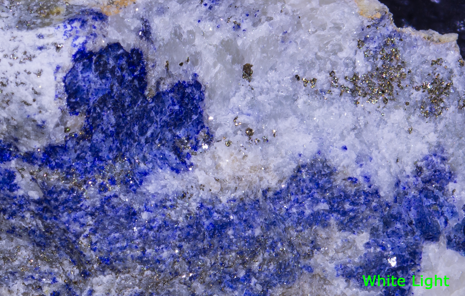 While there are numerous afghanite crystals it seems that the matrix is massive blue lazurite mixed with diopside. The diopside fluoresces bluish white under SW. Appears to be a mix of massive phlogopite, marialite, a white fluorescing mineral and maybe more.