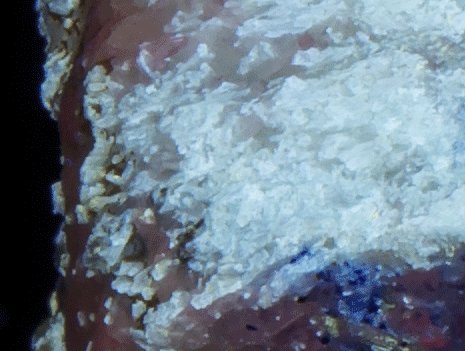 Under SW the calcite fluoresces a dark orange, and unknown crystals fluoresce a bluish white - my guess is that the white is diopside. Under MW (only) there are areas of a strong violet/blue fluorescence from fluorapatite - this is one of the few examples of MW only fluorescence I have observed.