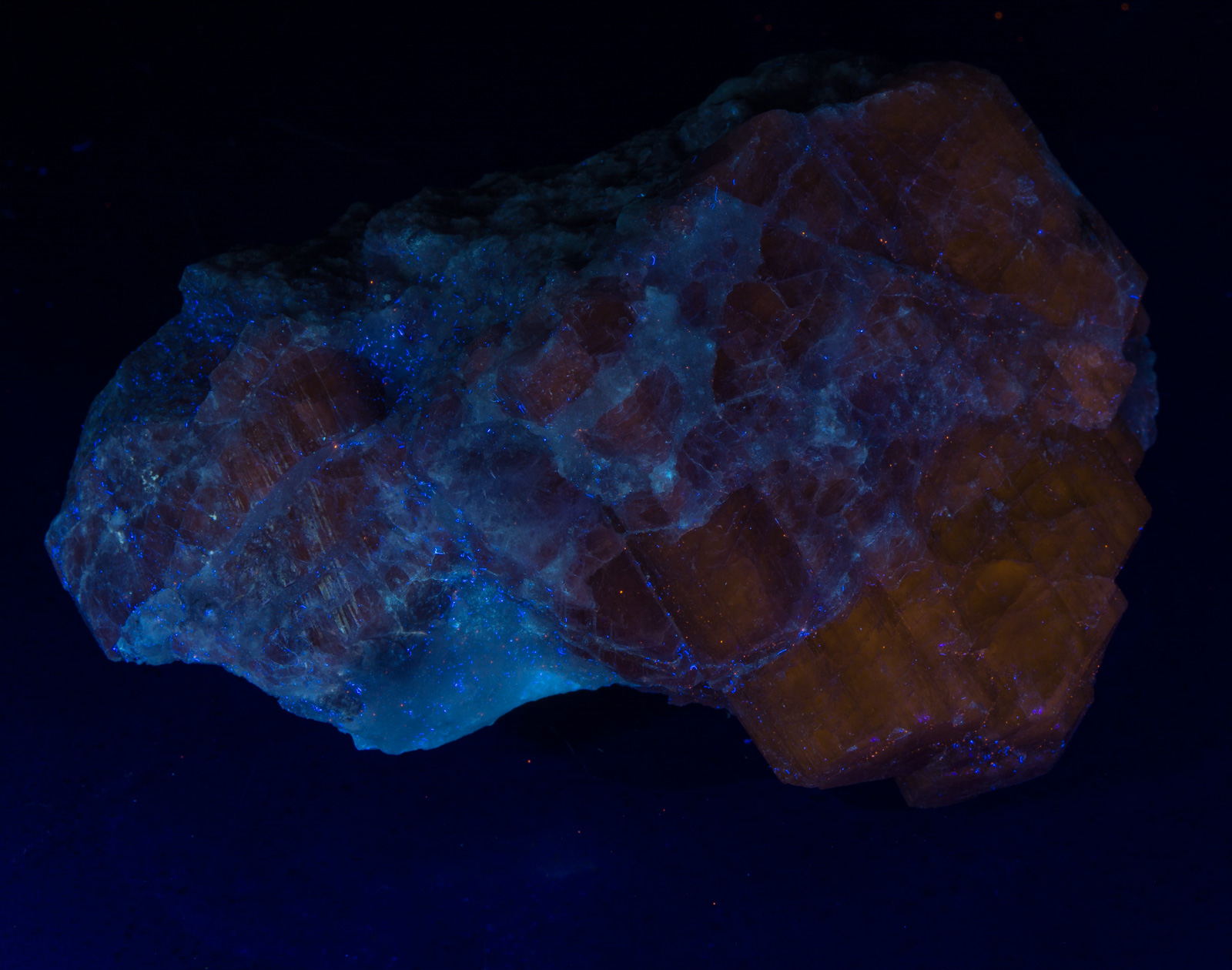 This piece is a large crystal of gem translucent piece of marialite. Under SW it fluoresces a deep red, and a dull yellow under LW, mixed with some bluish white.