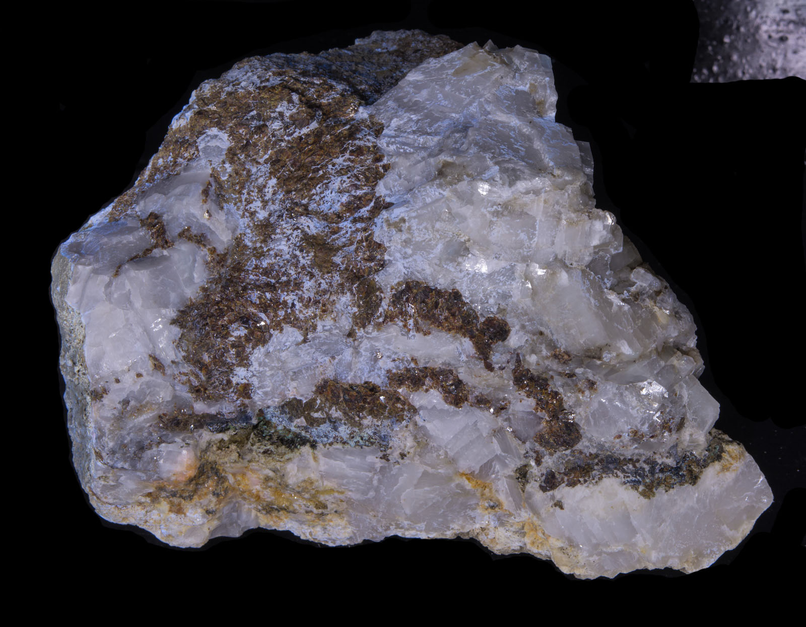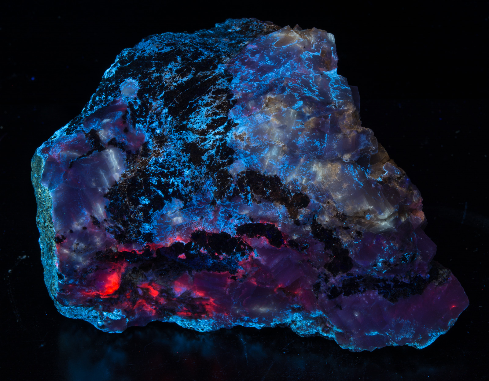 The Columbia Mine in Kentucky can yield some really pretty specimens if you are persistent and crack enough rocks. The rarest color is the red/pink calcite shown on this piece. Every rock has hydrozincite, and many show the yellow we see here - not sure what that is - possibly fluorite. The second picture shows the piece under white light.