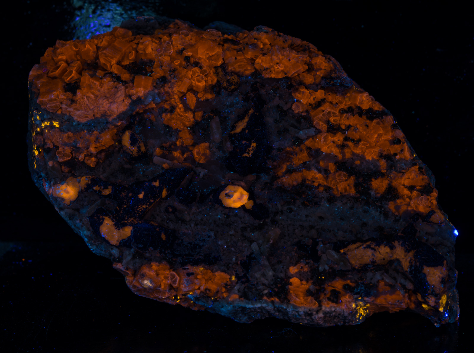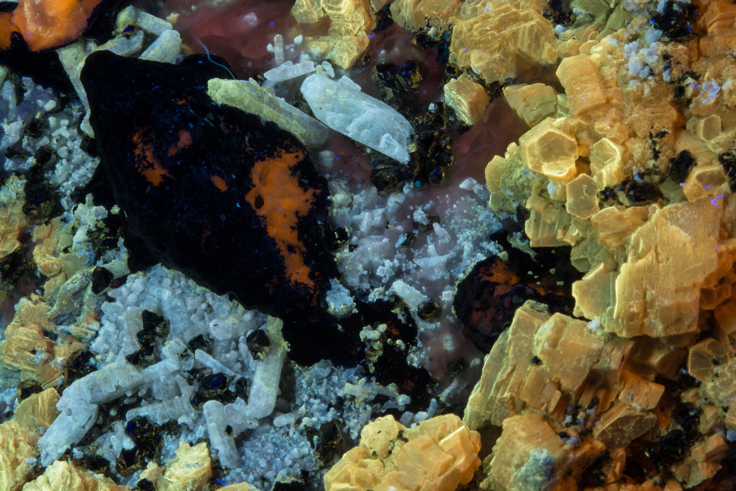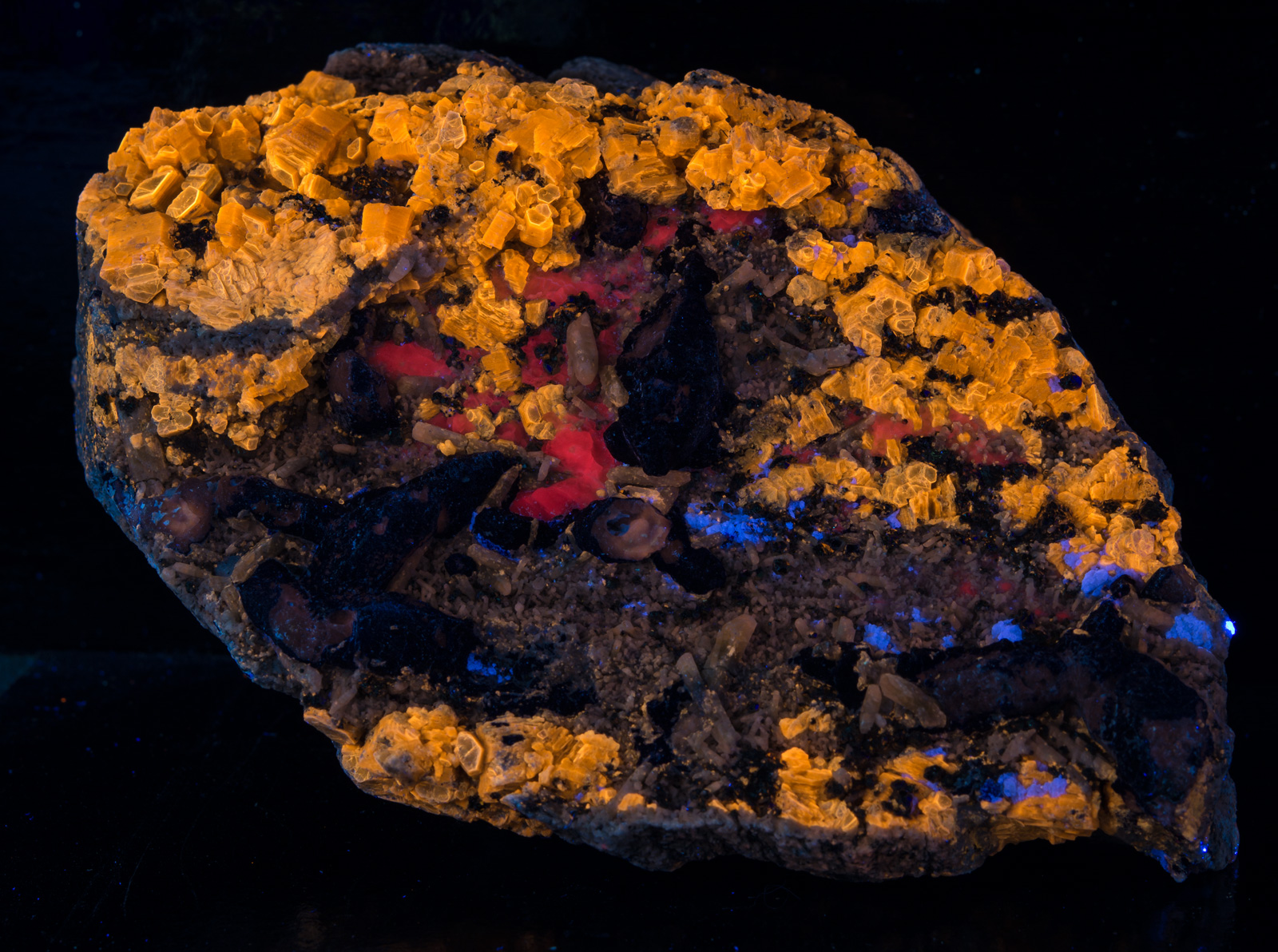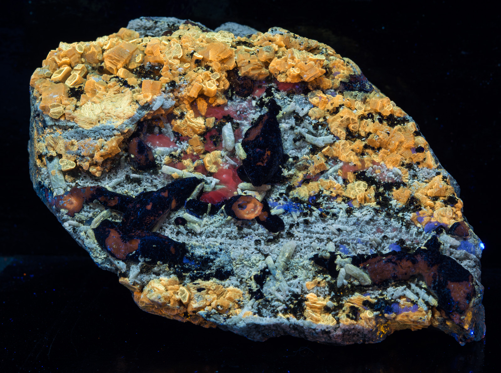 A lot going on with this amazing specimen from Badakhshan, Afghanistan. The first picture is shown under fullwave (SW+MW+LW) - phlogopite yellow, afghanite orange, calcite red, and white diopside crystals and fluorapatite that has blue fluorescence under MW. Best displayed under all three lamps: SW brings out the phlogopite and white diopside crystals, MW makes the calcite pop, and brings out a blue fluorescence from the fluorapatite, and LW is best for the afghanite. Individual pictures under each wavelength are shown in the 2nd gallery of thumbnails, and closeups in the 3rd gallery.