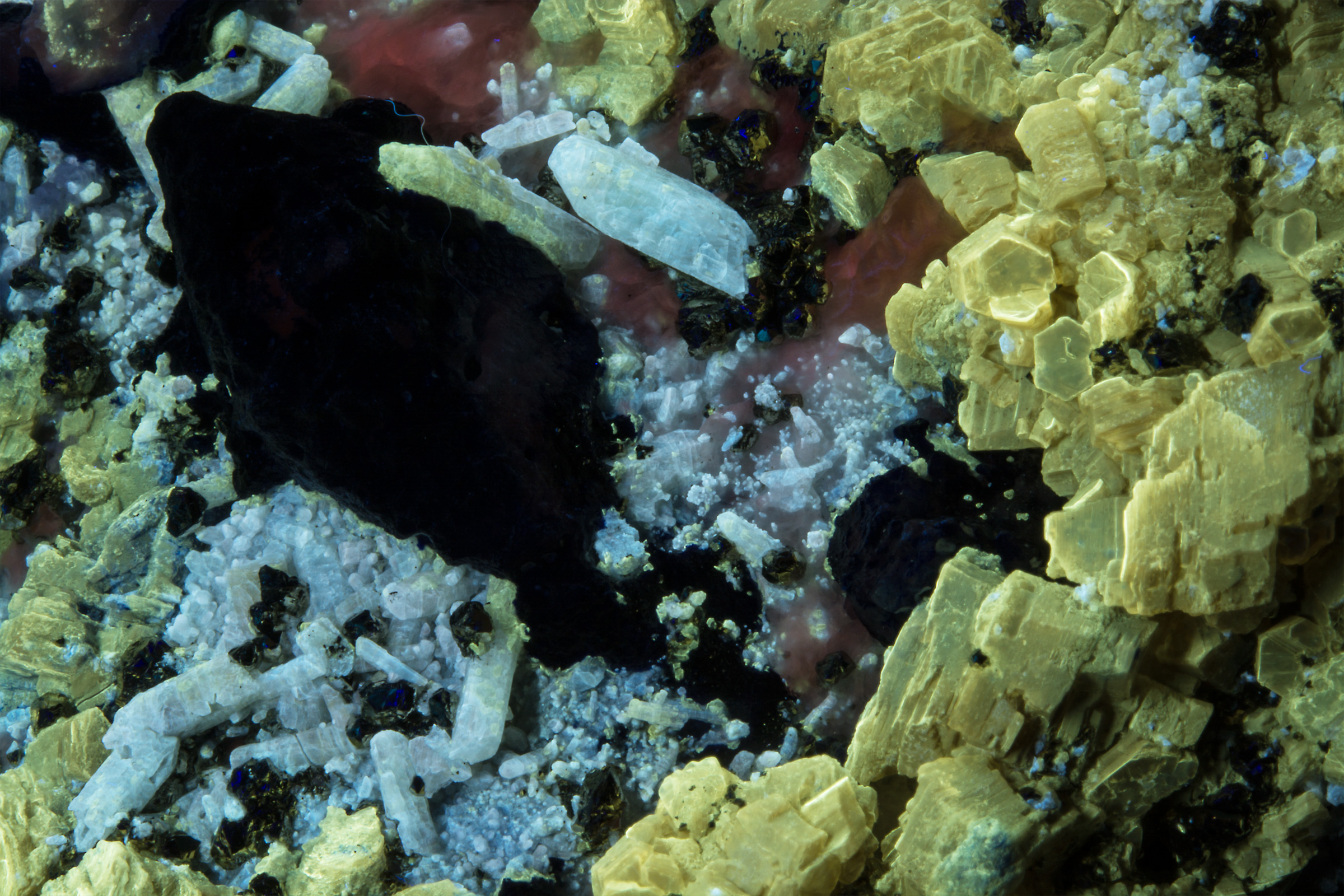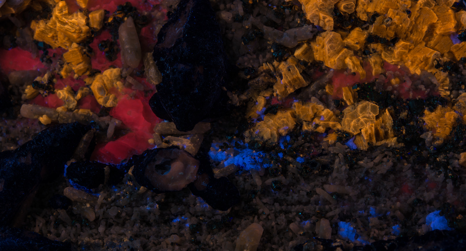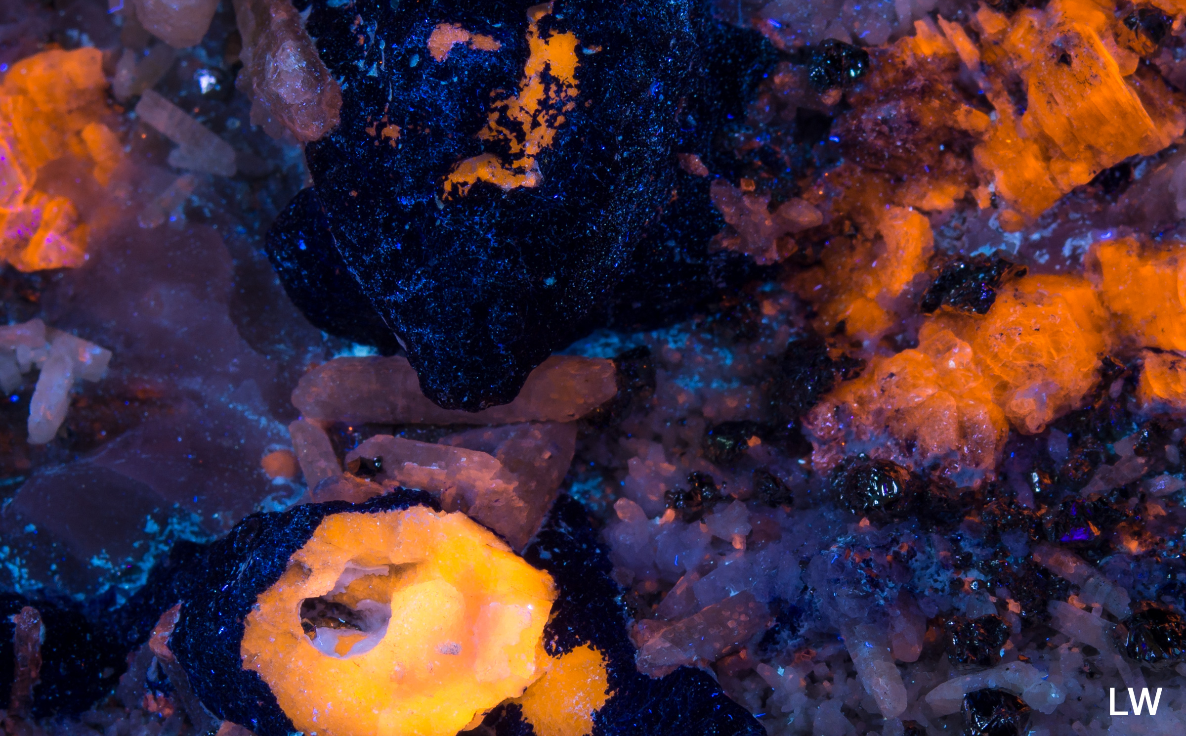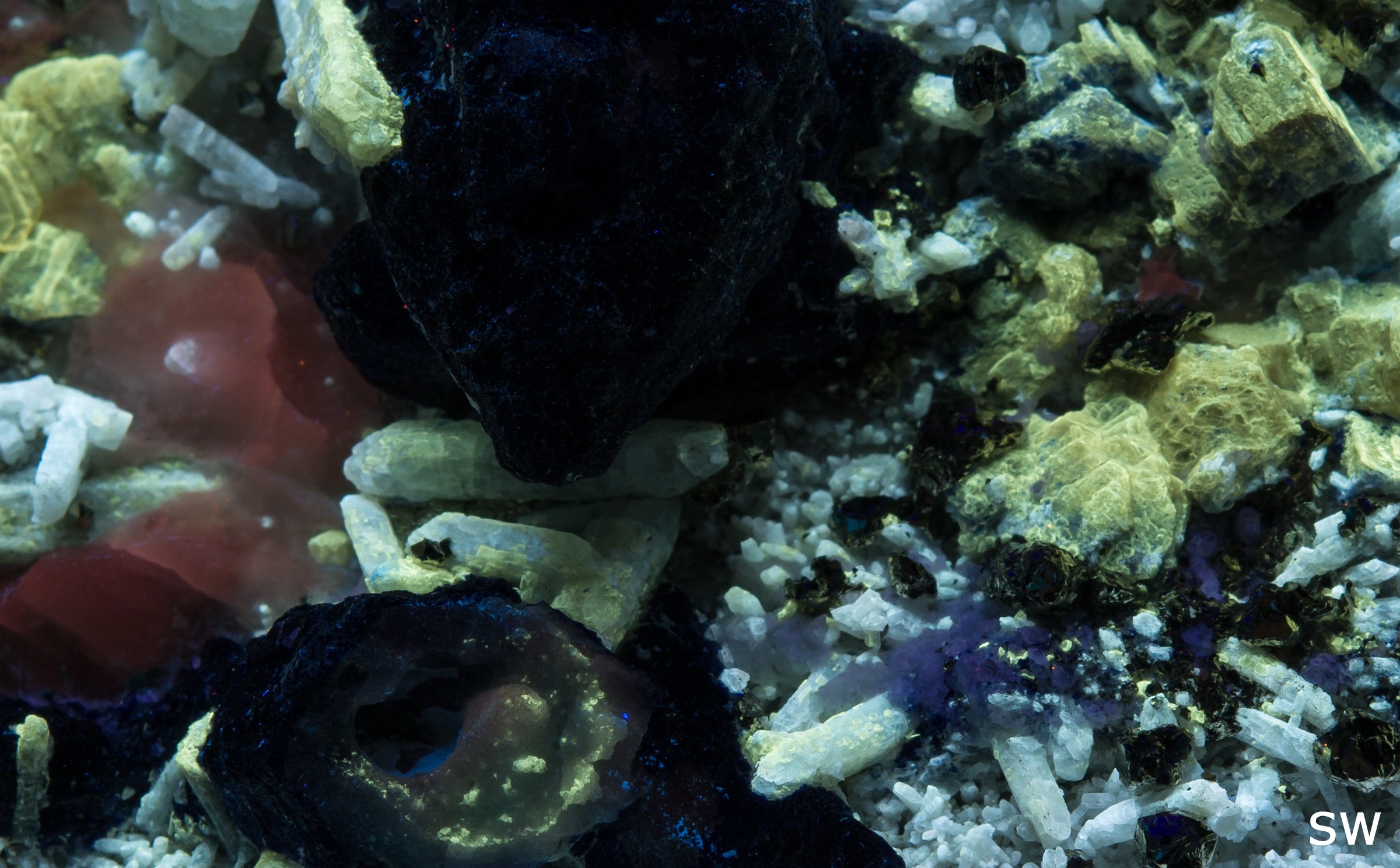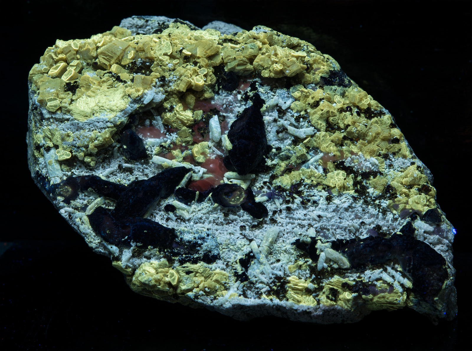 A lot going on with this amazing specimen from Badakhshan, Afghanistan. The first picture is shown under fullwave (SW+MW+LW) - phlogopite yellow, afghanite orange, calcite red, and white diopside crystals and fluorapatite that has blue fluorescence under MW. Best displayed under all three lamps: SW brings out the phlogopite and white diopside crystals, MW makes the calcite pop, and brings out a blue fluorescence from the fluorapatite, and LW is best for the afghanite. Individual pictures under each wavelength are shown in the 2nd gallery of thumbnails, and closeups in the 3rd gallery.