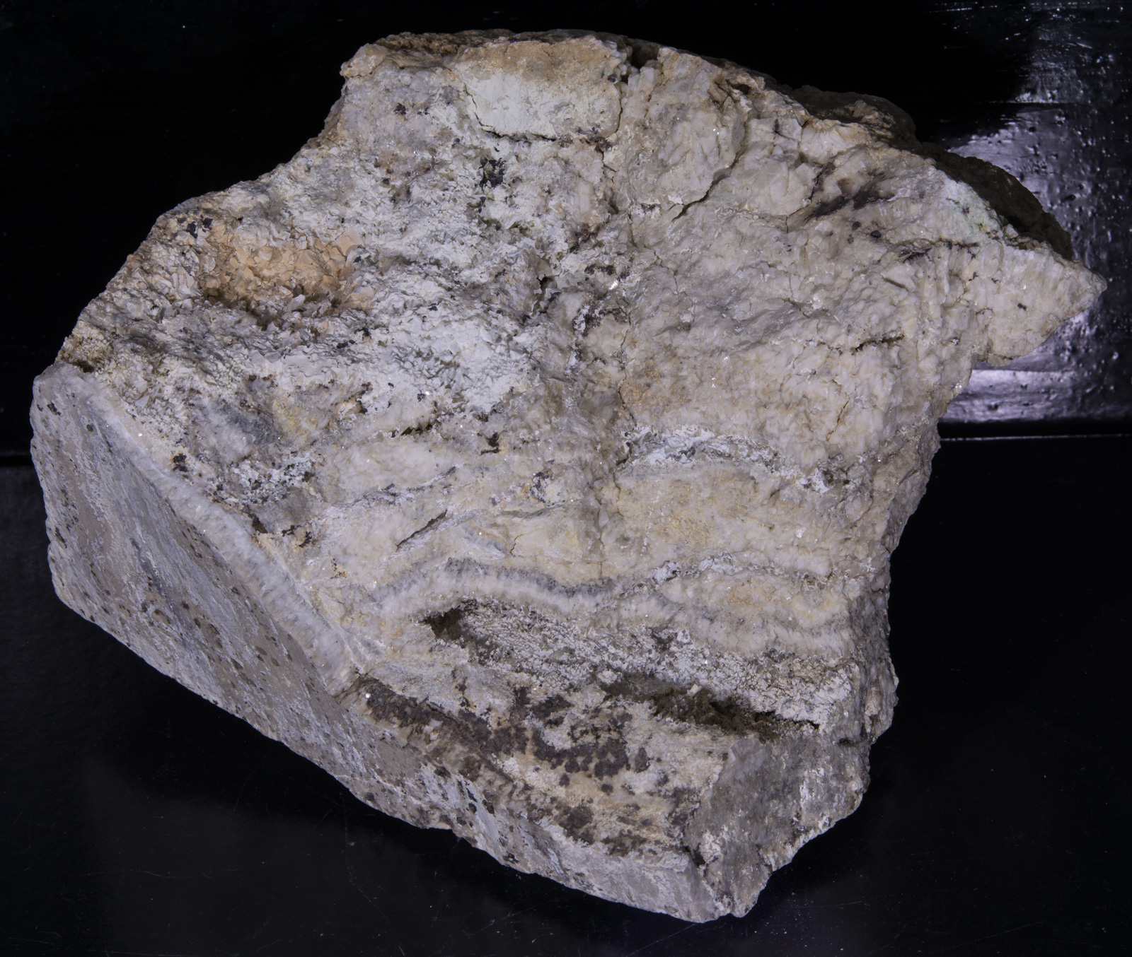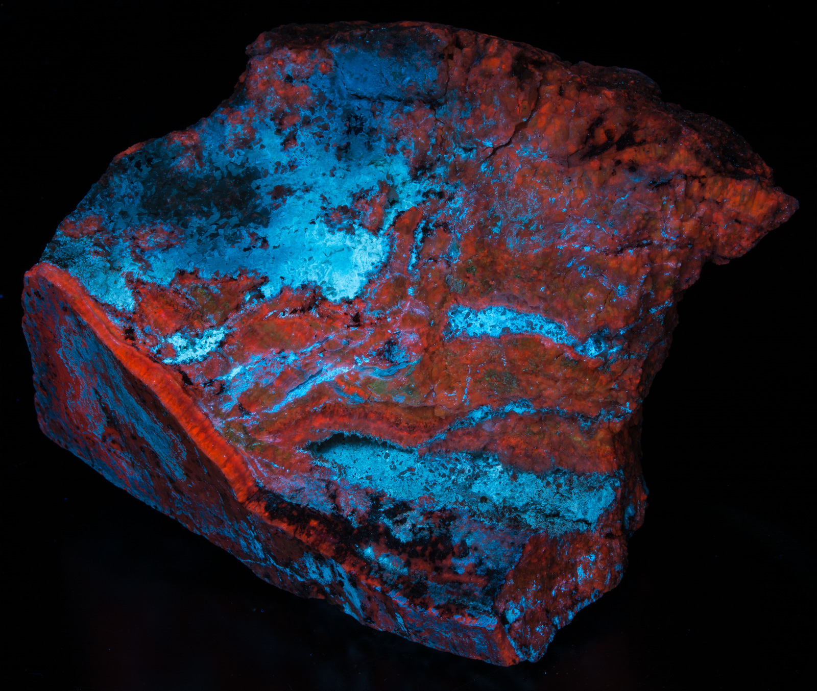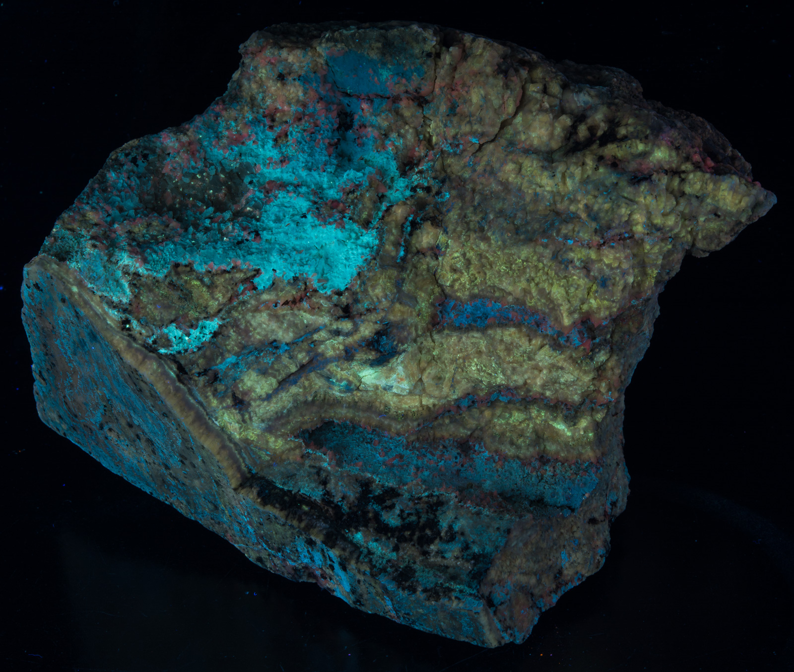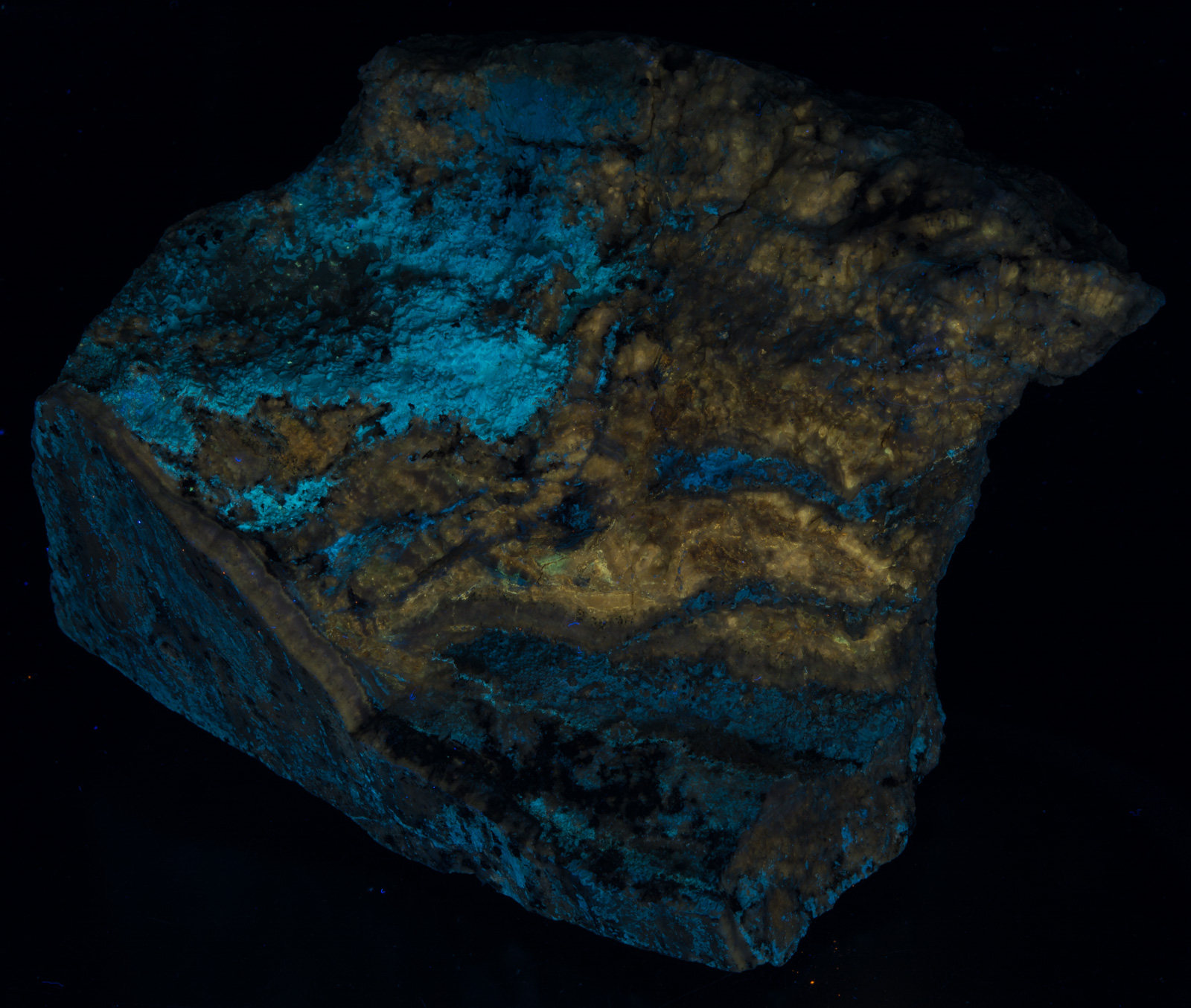 Large specimen of hydrozincite and calcite from the Salina Canyon Mine around Beaver Utah. What I find most interesting in this specimen is the calcite color shift to yellow under MW and LW. Another specimen in the database gives the locality as "Hurricane, UT" - I believe they are both the same.