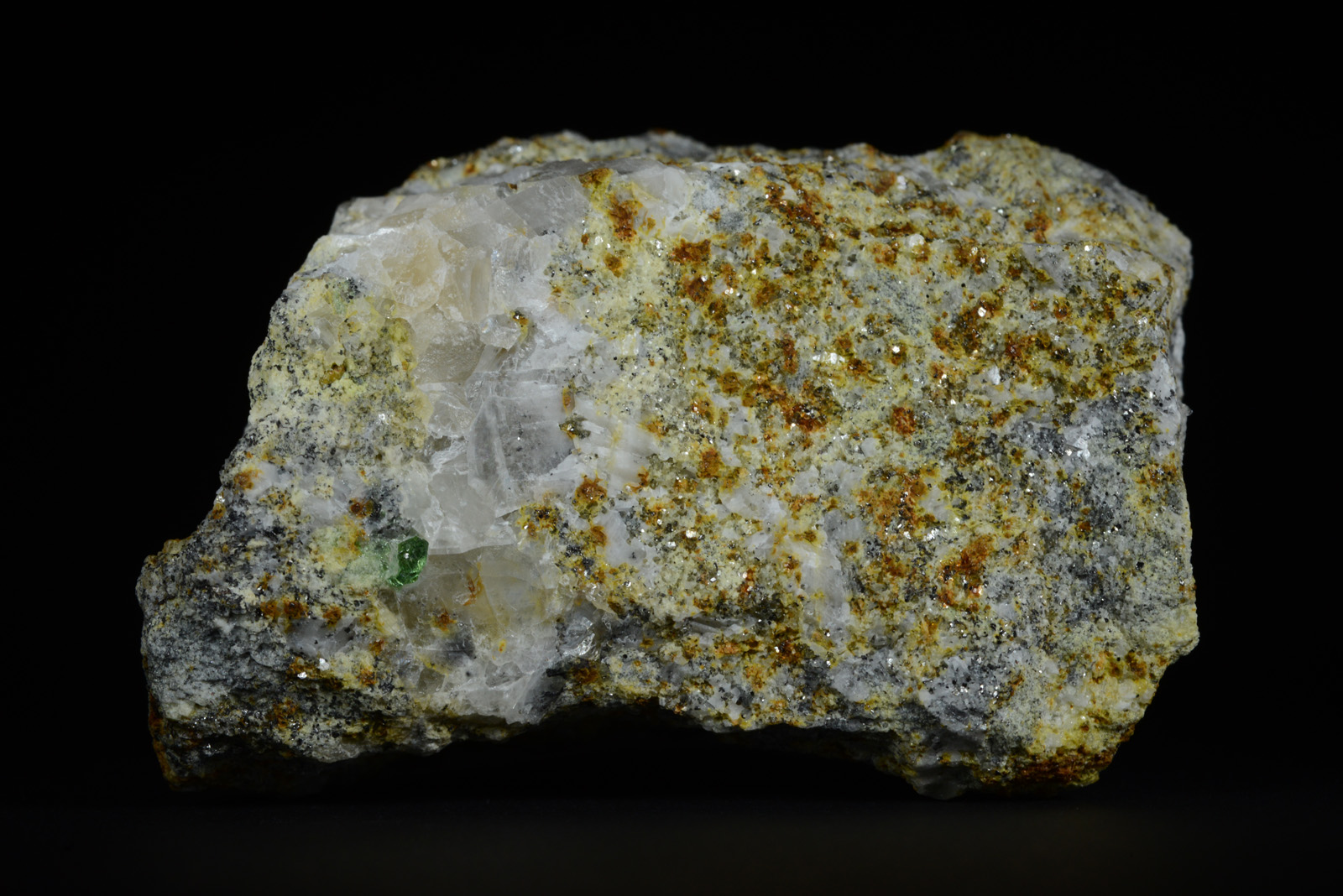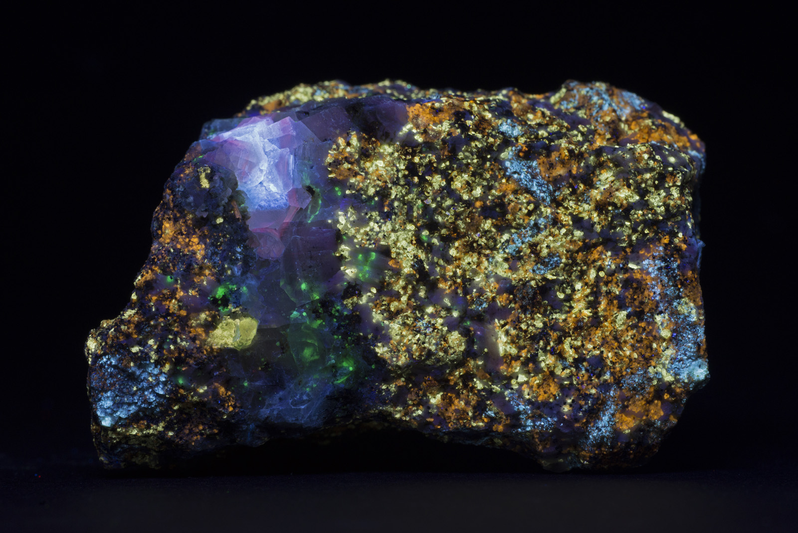 Here is a SEVEN color fluorescent specimen from the Merelani Hills in Tanzania. Under shortwave UV you can see yellow fluorescing phlogopite, blue fluorescing diopside, orange fluorescing meionite, green fluorescing hyalite, yellow fluorescing tsavorite, red fluorescing calcite and white fluorescing calcite. Under longwave UV you can see the yellow-orange fluorescing meionite and the white fluorescing calcite. This is an interesting daylight specimen as well with a bit of gemmy green tsavorite and pyrite. The Merelani Hills are famous for tanzanite and tsavorite gemstones, but I have not seen any significant fluorescents come from this location until now.
