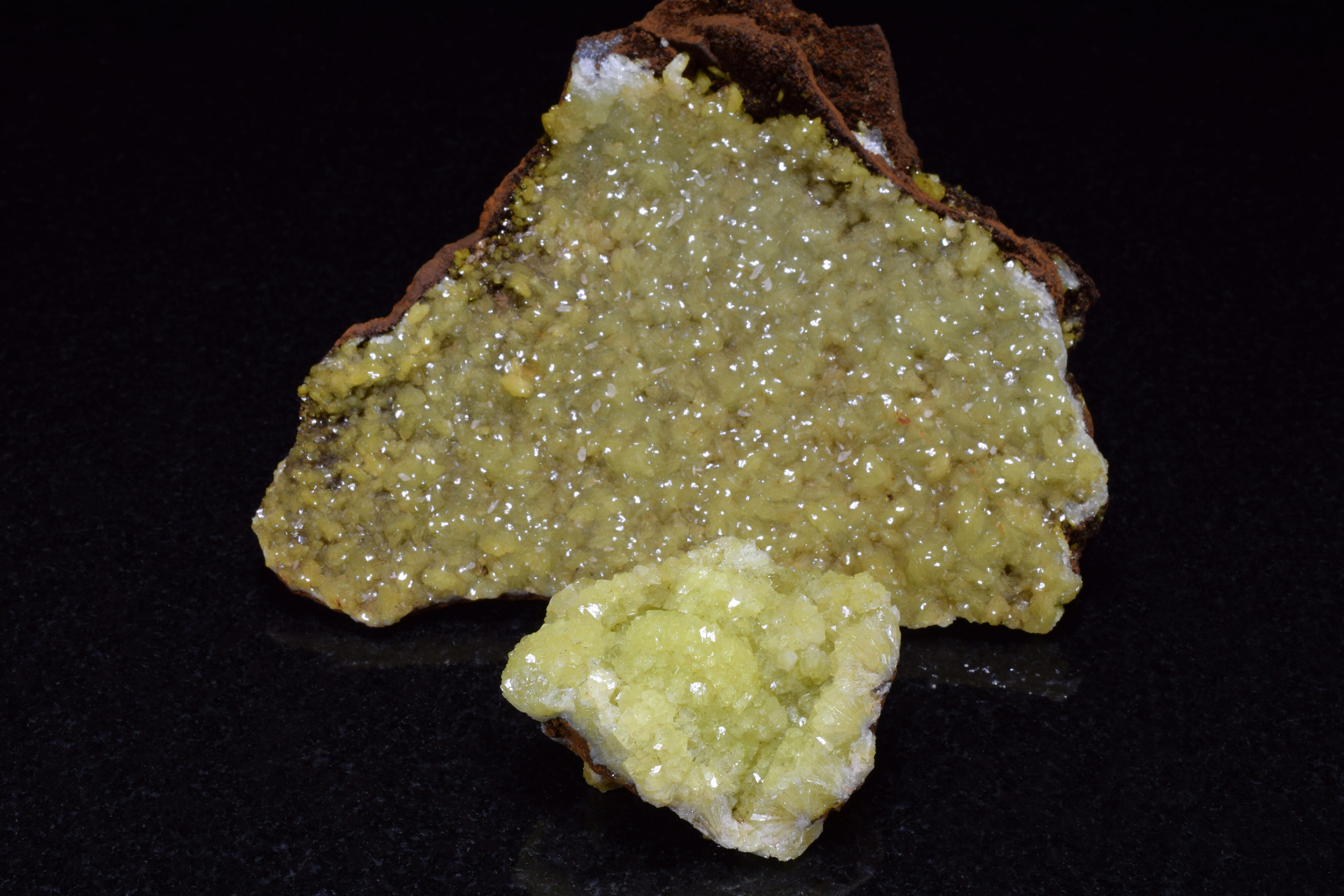 The following photograph shows two specimens of adamite from Mapimi, Mexico, as seen under visible light. One smaller specimen in the foreground, and a larger specimen in the background: