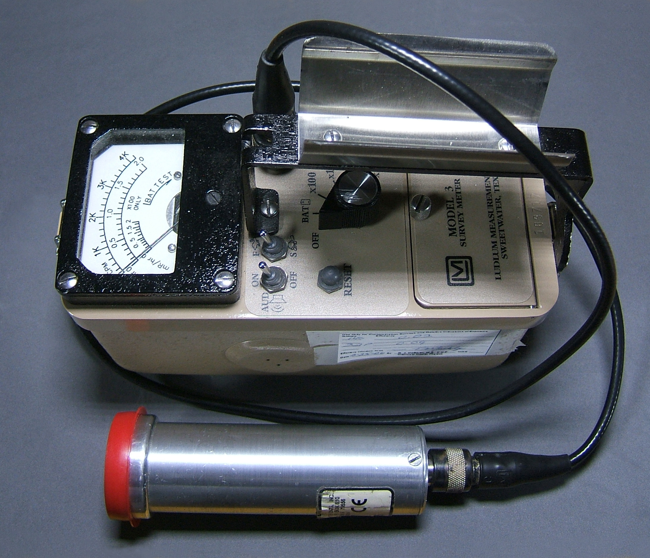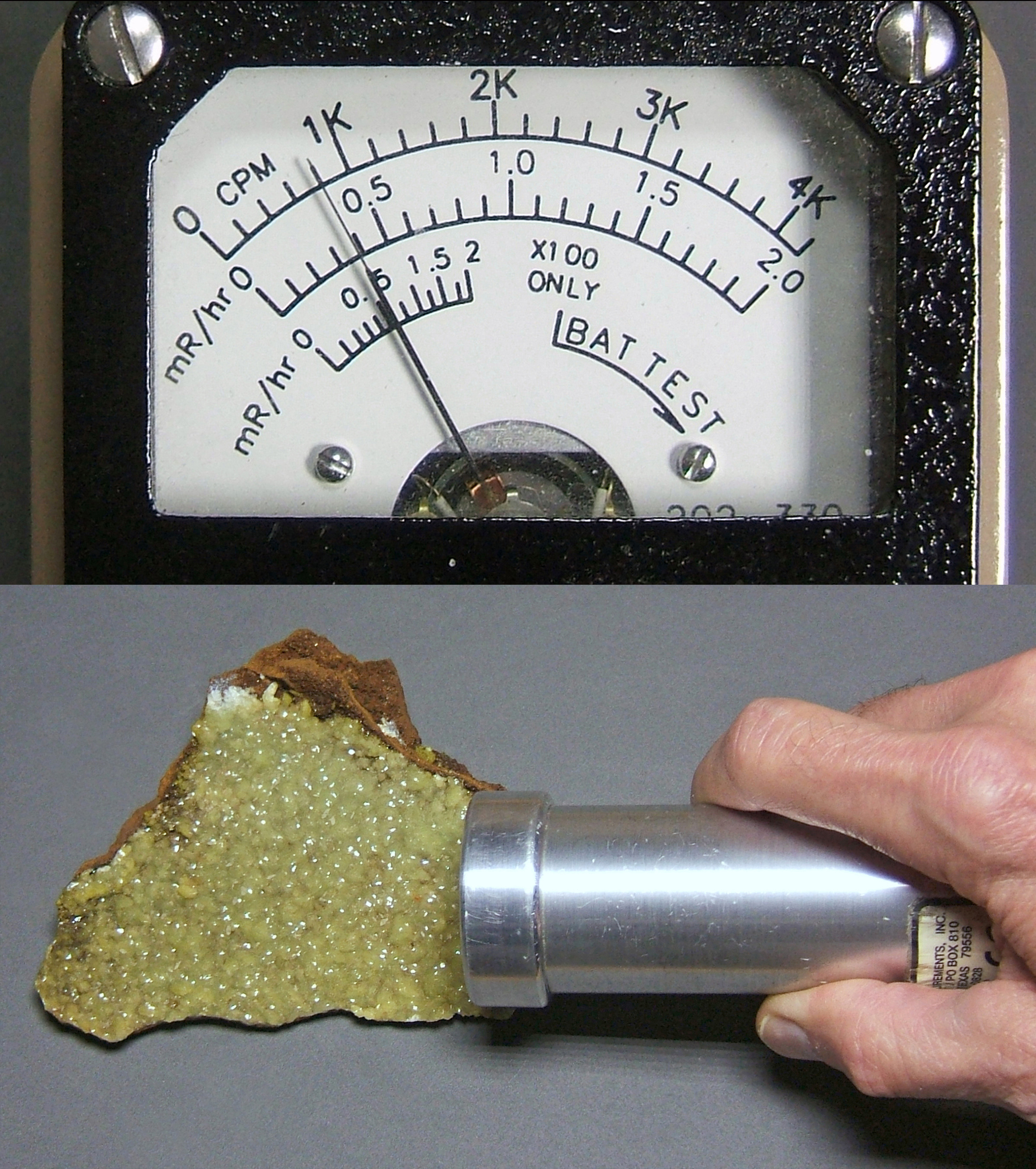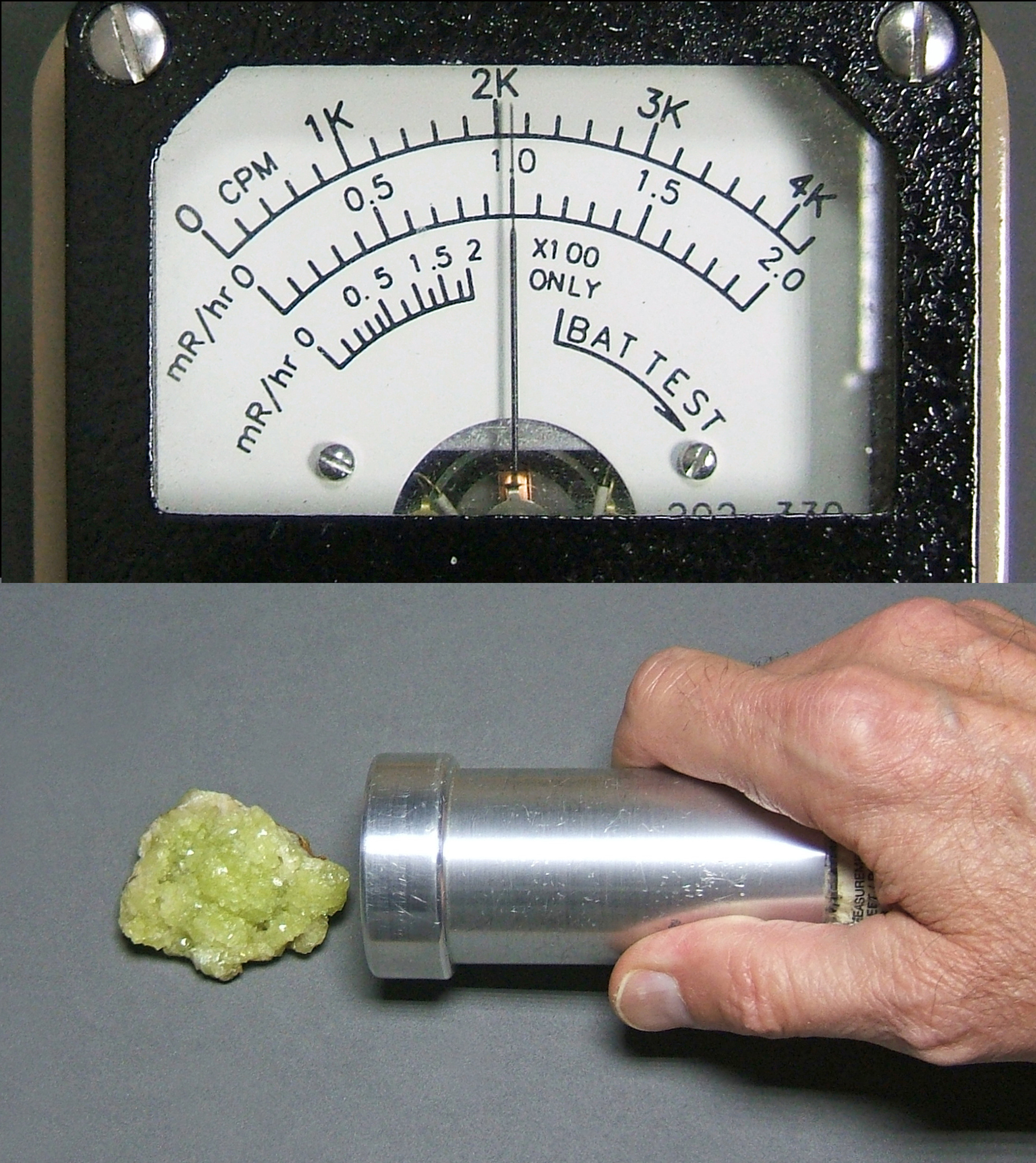 I thought it would be interesting to conduct a quick experiment to determine a potential explanation for the difference in fluorescence between these two specimens. Using a Geiger counter (Ludlum Model 3 Survey Meter) I measured the radioactivity emitted by each of these two specimens to obtain an estimate of the relative uranium content of each.
