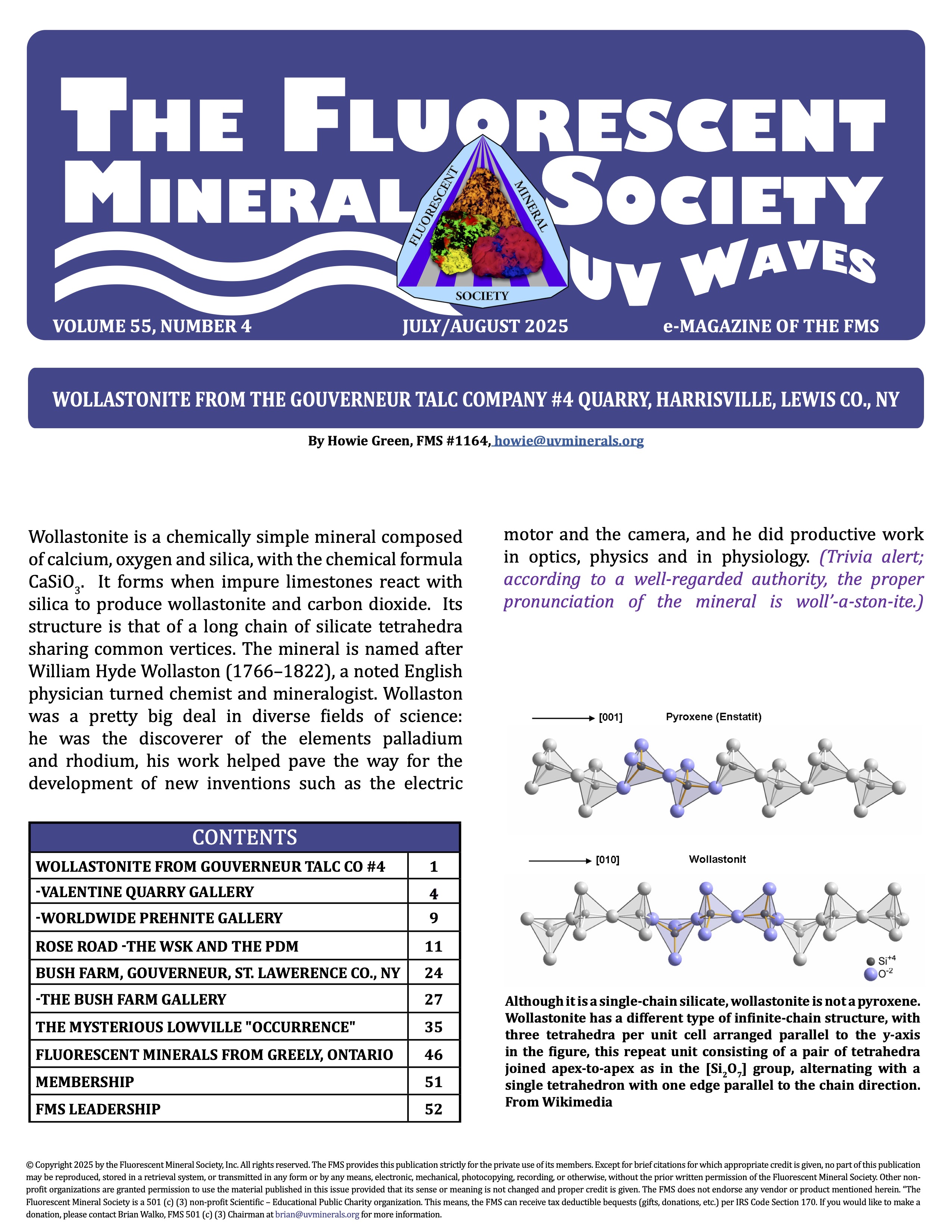 The Fluorescent Mineral Society publishes the Journal, a technical publication that presents original research on selected aspects of luminescence in minerals, and the UV Waves, a bi-monthly e-magazine. Although most of the articles are written by members, anyone may submit material for publication.